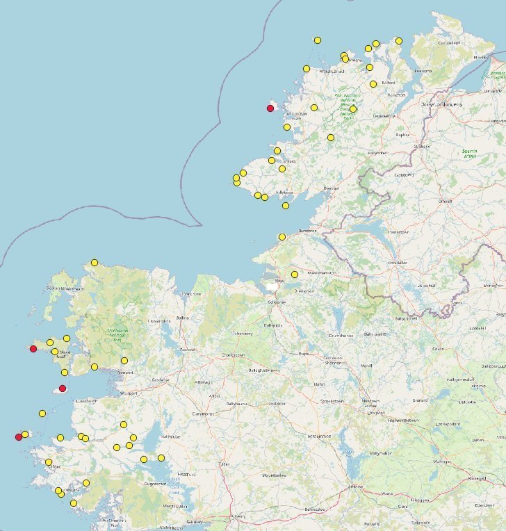 The Top North and West Ireland Grassland Fungi Sites - Click Dots for more information and close window after use or return to main map