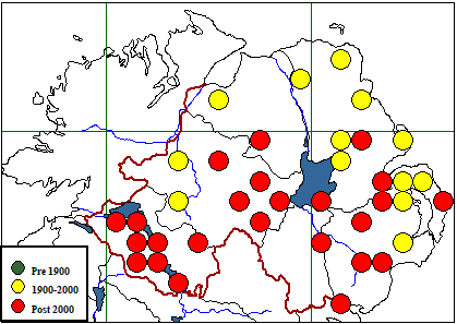 | Habitat (where recorded) & number of records: Woodland: broadleaved, semi-natural (13) Woodland and scrub (8) Woodland: mixed, semi-natural (8) Woodland: mixed (5) Neutral grassland: semi-improved (4) Parkland and scattered trees (4) Woodland: broadleaved (4) Woodland (3) Woodland: coniferous, plantation (3) Built up area, domestic (2) Acid grassland (1) Bog: raised (1) Grassland: acidic, unimproved, lowland (1) Scrub (1) Woodland: broadleaved, plantation (1) Woodland: coniferous (1) Woodland: coniferous, plantation, high forest (1) |