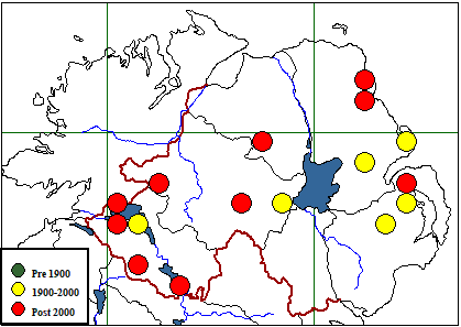 | Habitat (where recorded) & number of records: Woodland: broadleaved, semi-natural (4) Neutral grassland: semi-improved (3) Woodland and scrub (3) Woodland (2) Built up area, domestic (1) Calcareous grassland: unimproved (1) Grassland: acidic, semi-improved, upland (1) Grassland: calcareous, semi-improved, upland (1) Marsh/marshy grassland (1) Parkland and scattered trees (1) Scrub (1) Woodland: coniferous (1) Woodland: mixed (1) |