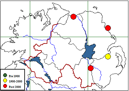| Habitat (where recorded) & number of records: Built up area, agricultural/forestry (1) Sand-dune: dune heath (1) Woodland: broadleaved, semi-natural (1) Woodland: mixed (1) |