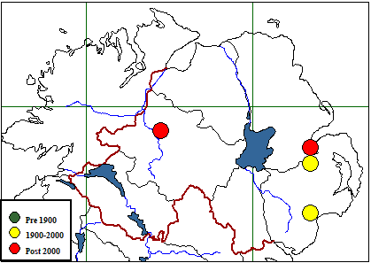 | Habitat (where recorded) & number of records: Woodland: coniferous, plantation (1) Woodland: coniferous, plantation, high forest (1) Woodland: mixed, plantation, high forest (1) |