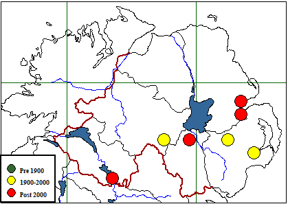 | Habitat (where recorded) & number of records: Woodland: broadleaved, semi-natural (2) Built up area, domestic (1) Natural rock exposures and caves excluding limestone pavemen (1) Neutral grassland: semi-improved (1) Parkland and scattered trees (1) Scrub (1) Scrub: scattered, neutral (1) Woodland: broadleaved, plantation (1) Woodland: broadleaved, plantation, high forest (1) Woodland: mixed, plantation (1) Woodland: mixed, plantation, high forest (1) |