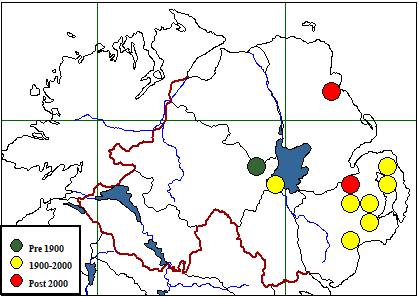 | Habitat (where recorded) & number of records: Woodland (2) Woodland: broadleaved, semi-natural (2) Woodland: mixed (2) Woodland: mixed, plantation, high forest (2) Neutral grassland: semi-improved (1) Parkland and scattered trees (1) Woodland: broadleaved, semi-natural, high forest (1) Woodland: coniferous (1) Woodland: mixed, plantation (1) |