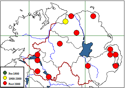 | Habitat (where recorded) & number of records: Woodland (3) Woodland and scrub (3) Woodland: broadleaved, semi-natural (3) Woodland: mixed (3) Neutral grassland: semi-improved (2) Built up area, domestic (1) Parkland and scattered trees (1) Parkland and scattered trees: mixed (1) Scrub (1) Woodland: broadleaved (1) |