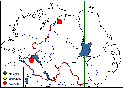 | Habitat (where recorded) & number of records: Grassland: calcareous, semi-improved, upland (1) Neutral grassland: semi-improved (1) Woodland (1) Woodland: broadleaved, semi-natural (1) Woodland: mixed (1) |
