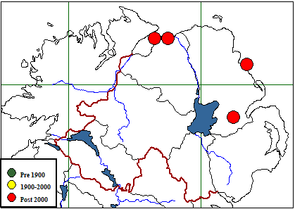 | Habitat (where recorded) & number of records: Grassland: acidic, upland (1) Woodland and scrub (1) |