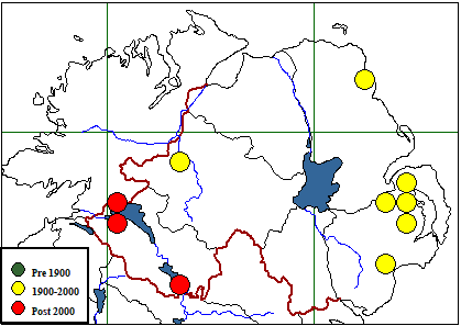 | Habitat (where recorded) & number of records: Woodland: broadleaved, semi-natural (4) Neutral grassland: semi-improved (2) Woodland (2) Woodland: mixed (2) Built up area, domestic (1) Grassland: acidic, unimproved, lowland (1) Grassland: calcareous, semi-improved, upland (1) Marsh/marshy grassland (1) Parkland and scattered trees (1) Scrub (1) |