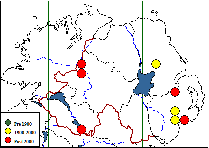 | Habitat (where recorded) & number of records: Neutral grassland: semi-improved (2) Woodland: coniferous (2) Woodland: coniferous, plantation (1) Woodland: mixed, plantation (1) |