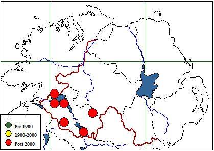 | Habitat (where recorded) & number of records: Woodland: broadleaved, semi-natural (9) Neutral grassland: semi-improved (7) Parkland and scattered trees (6) Built up area, domestic (5) Woodland: mixed (5) Woodland (4) Woodland: broadleaved (4) Scrub (3) Woodland: coniferous, plantation (2) Marsh/marshy grassland (1) |