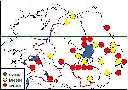 | Habitat (where recorded) & number of records: Woodland: mixed (3) Parkland and scattered trees: mixed (2) Acid grassland (1) Built up area, domestic (1) Calcareous grassland (1) Neutral grassland (1) Neutral grassland: semi-improved (1) Parkland and scattered trees (1) Scrub (1) Woodland (1) Woodland: broadleaved, semi-natural (1) |