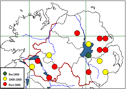 | Habitat (where recorded) & number of records: Woodland: coniferous, plantation (3) Woodland: broadleaved, semi-natural (2) Acid grassland (1) Parkland and scattered trees (1) Woodland (1) Woodland: mixed, plantation (1) Woodland: mixed, semi-natural (1) |