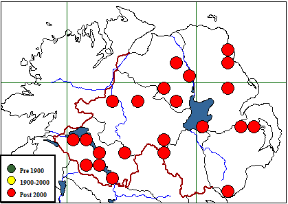 | Habitat (where recorded) & number of records: Woodland and scrub (7) Woodland: broadleaved, semi-natural (5) Neutral grassland: semi-improved (4) Woodland (4) Woodland: mixed, semi-natural (4) Scrub (3) Built up area, domestic (2) Parkland and scattered trees (2) Woodland: broadleaved (2) Woodland: mixed (2) Bog (1) Grassland and marsh (1) Grassland: calcareous, semi-improved, upland (1) Parkland and scattered trees: mixed (1) |