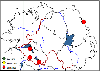 | Habitat (where recorded) & number of records: Woodland: broadleaved, semi-natural (9) Neutral grassland: semi-improved (4) Built up area, domestic (2) Parkland and scattered trees (2) Scrub (2) Woodland (2) Woodland: broadleaved (2) Woodland: mixed (2) Woodland: mixed, semi-natural (1) |