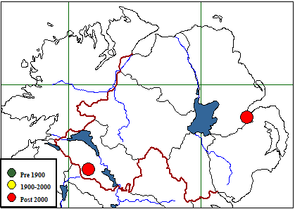 | Habitat (where recorded) & number of records: Built up area, domestic (1) Neutral grassland: semi-improved (1) Parkland and scattered trees (1) Woodland (1) Woodland: broadleaved (1) Woodland: broadleaved, semi-natural (1) Woodland: coniferous, plantation (1) Woodland: mixed (1) |