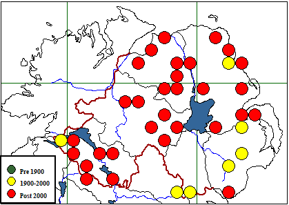 | Habitat (where recorded) & number of records: Woodland and scrub (8) Woodland: broadleaved, semi-natural (6) Woodland (4) Woodland: broadleaved (3) Woodland: mixed, plantation (2) Woodland: mixed, semi-natural (2) Acid grassland: semi-improved (1) Boundaries: hedge with trees, species-rich (1) Woodland: coniferous, plantation (1) Woodland: mixed (1) Woodland: plantation (1) |