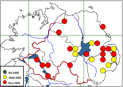 | Habitat (where recorded) & number of records: Woodland and scrub (7) Woodland: broadleaved, semi-natural (7) Parkland and scattered trees: mixed (6) Woodland: mixed (6) Neutral grassland: semi-improved (4) Woodland (3) Woodland: broadleaved (3) Boundaries: defunct hedge, species-poor (1) Built up area, domestic (1) Parkland and scattered trees (1) Parkland and scattered trees: broadleaved (1) Scrub (1) Woodland: broadleaved, plantation, high forest (1) Woodland: broadleaved, semi-natural, high forest (1) Woodland: mixed, plantation (1) Woodland: mixed, plantation, high forest (1) Woodland: mixed, semi-natural (1) |