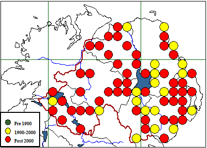| Habitat (where recorded) & number of records: Woodland and scrub (23) Woodland: mixed (14) Woodland: broadleaved, semi-natural (13) Woodland (11) Parkland and scattered trees: mixed (7) Woodland: broadleaved (7) Woodland: broadleaved, plantation (6) Woodland: coniferous, plantation (5) Woodland: mixed, plantation (5) Neutral grassland: semi-improved (4) Parkland and scattered trees (4) Woodland: coniferous (4) Woodland: mixed, semi-natural (3) Marsh/marshy grassland (2) Bog: raised (1) Built up area, domestic (1) Sand-dune (1) Sand-dune: dune scrub (1) Woodland: broadleaved, semi-natural, high forest (1) Woodland: mixed, plantation, high forest (1) |
