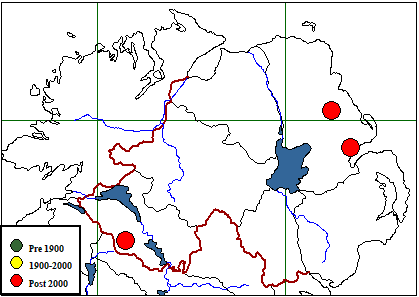 | Habitat (where recorded) & number of records: Built up area, domestic (1) Neutral grassland: semi-improved (1) Parkland and scattered trees (1) Wet dwarf shrub heath (1) Woodland (1) Woodland: broadleaved (1) Woodland: broadleaved, semi-natural (1) Woodland: coniferous, plantation (1) Woodland: mixed (1) |