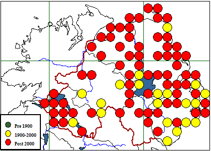 | Click on the dots to get a species list for the 10km square that it represents. | |